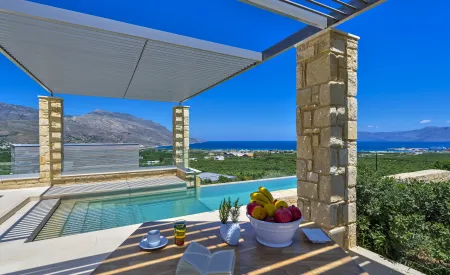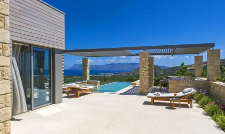 Eine sehr geeignete und erstklassige Unterkunftsoption für ein frisch verheiratetes Paar oder eine Familie mit 2 plus 1 Personen, die mit Blick auf die nordöstliche Kissamos-Bucht und eine der unberührtesten Regionen mit absoluter Privatsphäre zwischen Olivenbäumen und einheimischen Kräutern entworfen wurde Natur des nordwestlichen Kreta.