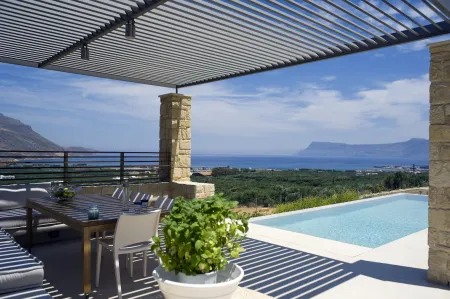 Entspannen Sie sich in dieser Villa, die auf majestätische Weise Natur und Luxus verbindet, und genießen Sie das Erlebnis einer einzigartigen Ferienvilla inmitten eines typisch kretischen Landes inmitten von Kräutersträuchern und Vegetationsgärten mit Blick auf die Ägäis, nur einen Kilometer vom nächsten Strand entfernt, in der Nähe der Stadt Kissamos .