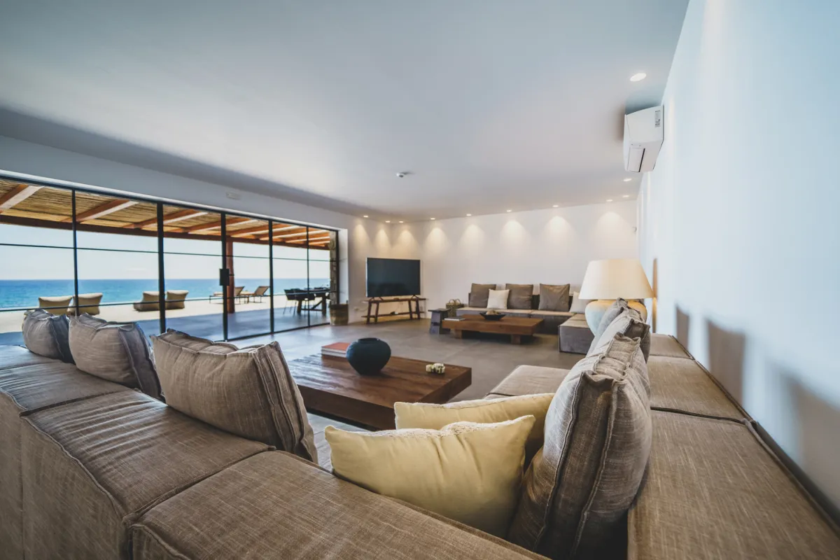 Treten Sie ein und entdecken Sie einen großzügigen und stilvollen offenen Wohnbereich. Das moderne Wohnzimmer ist mit bequemen Sitzgelegenheiten und einem Smart-HDTV ausgestattet und bietet eine entspannende, klimatisierte Umgebung zum Entspannen nach einem Tag voller Sonne und Meer.