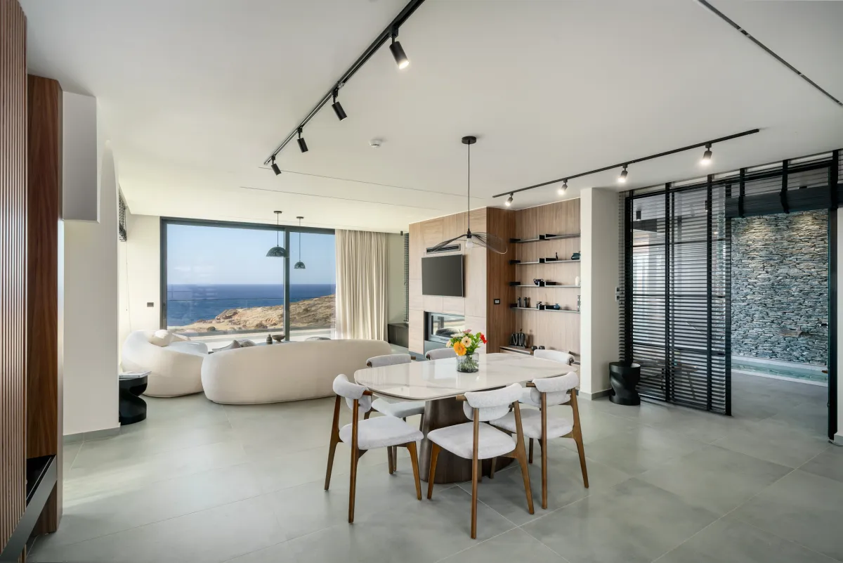 Das Erdgeschoss empfängt Sie mit einem hellen und geräumigen Wohnzimmer, ausgestattet mit einem 55-Zoll-Smart-TV, einem Kamin und bodentiefen Fenstern mit ungestörtem Meerblick. Der elegante Essbereich und die voll ausgestattete Küche bieten den idealen Rahmen für gemeinsame Mahlzeiten und gesellige Treffen. Unter der Treppe befindet sich ein separater Arbeitsbereich mit Schreibtisch und ergonomischem Stuhl – eine helle und ruhige Ecke zum Arbeiten oder Lesen, unterstützt durch das Highspeed-Internet der Villa (300 Mbit/s).