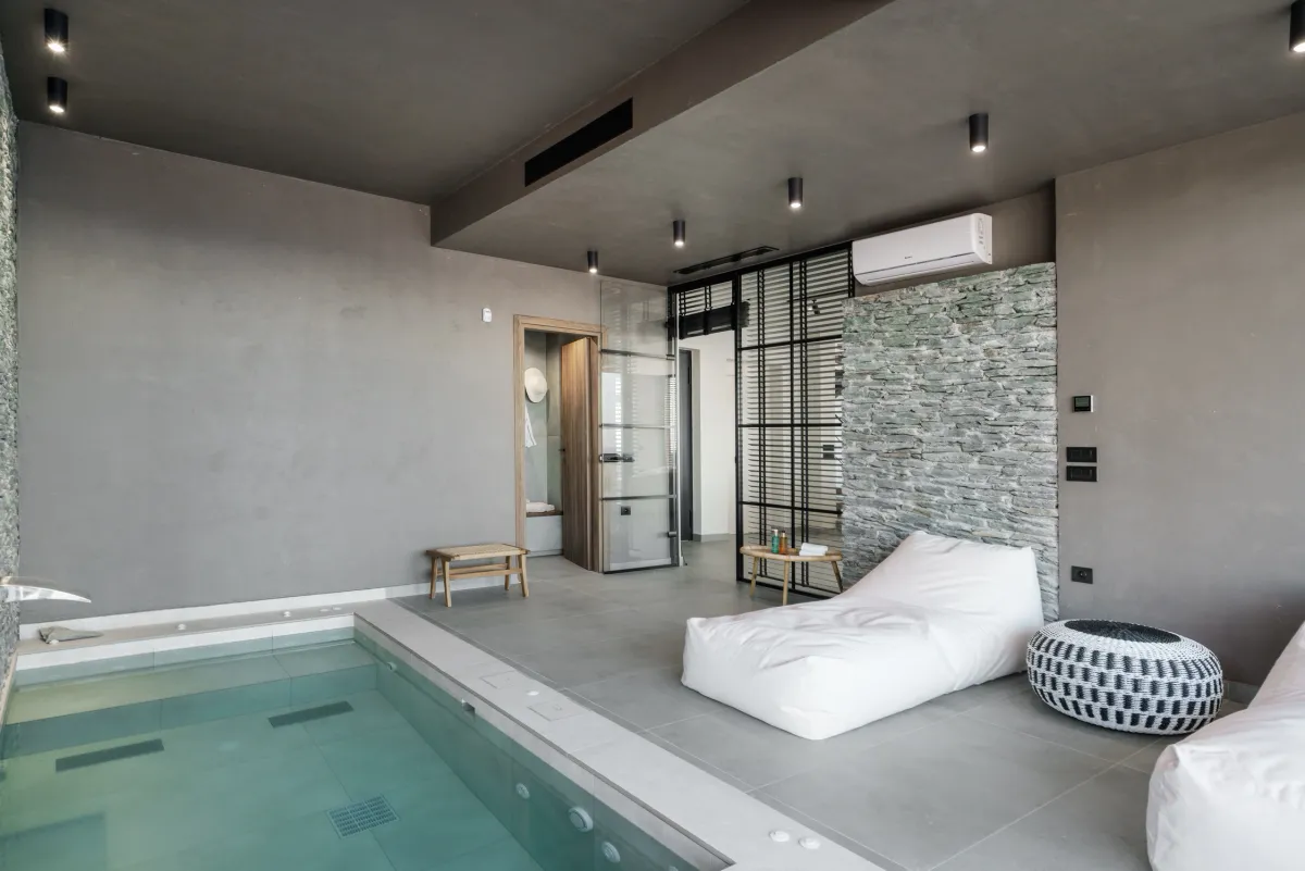 Gäste können sich außerdem im separaten Whirlpool-Raum entspannen, der zu jeder Tageszeit zum Wohlfühlen einlädt. Dieser Raum verfügt über ein eigenes WC mit Umkleidekabine und Dusche. Die umlaufenden Balkone mit Gartenmöbeln bieten die perfekten Plätze, um den Sonnenaufgang oder Sonnenuntergang zu genießen. Im Erdgeschoss befindet sich zudem ein weiteres WC.