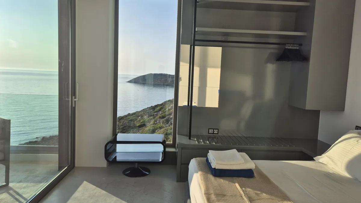 This exclusive master bedroom is located on the first floor by the sea. It has access to a large terrace and offers a double bed with a high-quality Dunlopillo mattress (170 * 200 * 21 cm). This space was originally designed for 2 small bedrooms, but plans were changed during construction, resulting in a large master bedroom with a freestanding designer bathroom providing a unique bathing experience with unrivaled sea views.