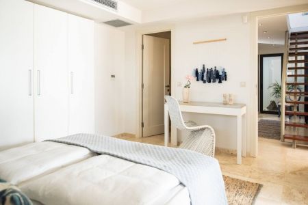 The Mediterranean villa’s living room is naturally lit, open and spacious. The villa’s contemporary design and clever architecture give it a cool and calming atmosphere for visitors to enjoy. The lounge is furnished with elegant yet comfortable sofas and armchairs and fitted with a flat-screen TV and Netflix. The dining room is tastefully finished and furnished with a large dining table and seating for guests to gather around. The state-of-the-art kitchen will fulfill all visitors’ requirements.