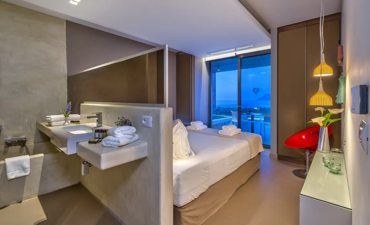 The Youphoria Villa Oneiro is situated above the quaint Cretan village of Agios Georgios in Chania, a fashionable holiday destination in Greece. The stylish villa is near to a few magnificent beaches, restaurants, and shops. The luxurious Villa Oneiro is also a lovely place to peacefully unwind on a restful, private vacation.