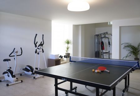 Both villas feature cozy living rooms, professional chef’s kitchens to cater for all your culinary requirements, marble bathrooms, and 16 bedrooms with capacity to host in luxury and comfort 32 guests. The terrace, pool, outdoor kitchen with barbecue facilities and al fresco dining areas are perfect to linger over a glass of Cretan wine under the blue sky lighting for this magical scenery. For larger parties on holiday together, this property rental includes a secluded scenic private playground, where children can play freely and safely without having to leave the site. Within the grounds of the Estate, there is a private tennis court adaptable for pickleball, volleyball, and half basketball, all featuring a premium cushioned, 4-layer, surface designed for superior comfort and performance. Effectively four private courts in one.