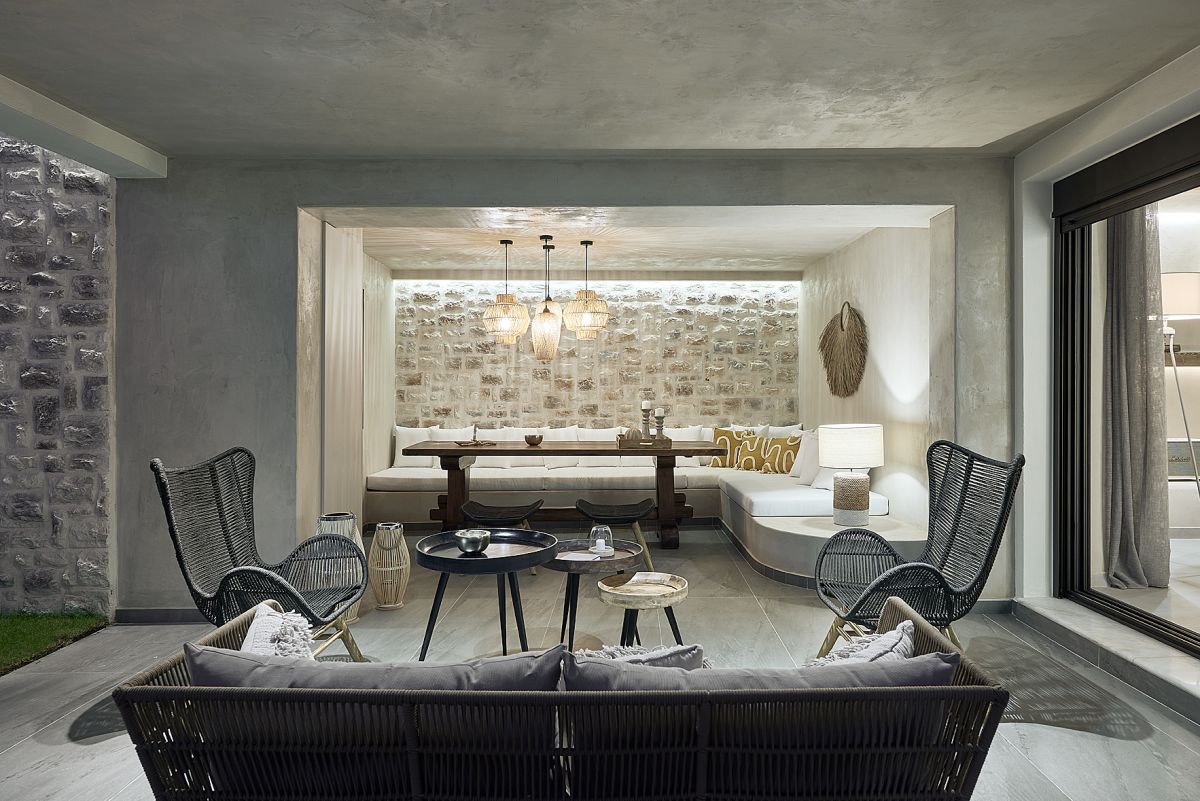 Nestled in a charismatic beachfront location, this gem property is a feast for the sense blended into the vast blue sea with interior and exterior spaces of distinct character and use, making it an ideal destination for families and couples looking for a change of scenery, on the outskirts of Agios Nikolaos just above Almyros Beach in eastern Crete.