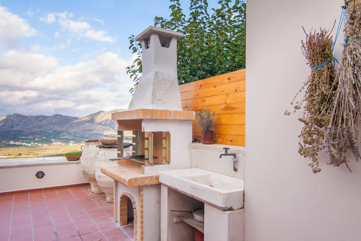 Outdoors, Rogdia Villa offers the perfect setting for enjoying Crete’s sunny climate. A private pool (6 m x 3 m) with sunbeds and an umbrella invites you to cool off, while the outdoor shower provides refreshment after a swim. A built-in BBQ and outdoor dining table create an ideal setting for al fresco meals surrounded by nature. Street parking is available nearby for convenience.
