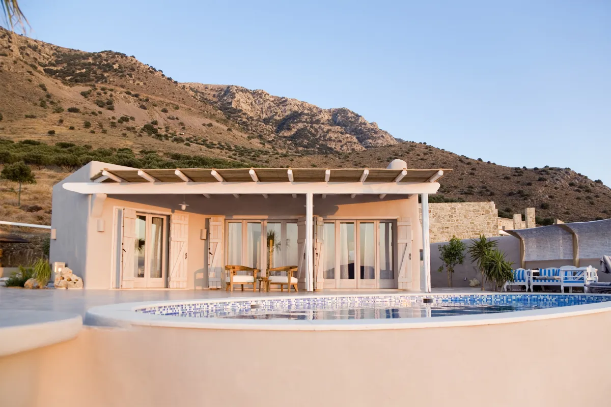 Villa Achilleas de forme organique, ambiance cycladique avec piscine et vue inoubliable sur le golfe de Mirabello