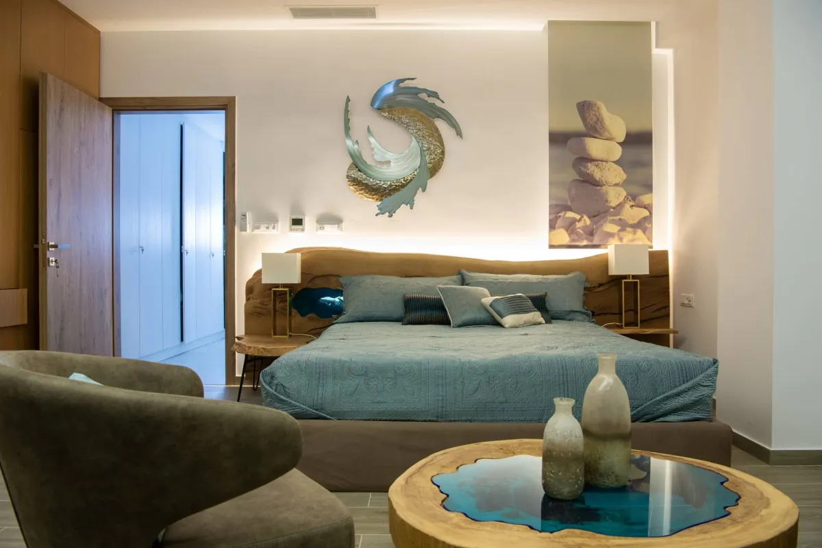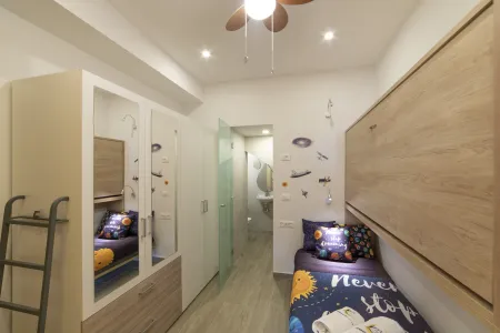 Sur le côté ouest de Moonlight Villa, près de la terrasse de la piscine, le studio Ganymède dispose d'un salon confortable avec une petite chambre dotée d'un lit double, d'un canapé d'angle et d'une chaise convertible en lit simple. Il y a aussi un lit mezzanine au-dessus du plafond de la salle de bain dans lequel un enfant peut dormir. Ganymède peut accueillir un total de 4 personnes. La grande fenêtre donne sur le paisible jardin arrière, tandis qu'une plus petite donne sur la mer.